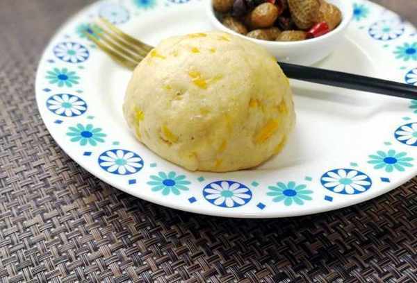 3、酵母用溫水化開,將南瓜塊和面粉放入大碗中,然後慢慢倒入酵母水,攪拌均勻,揉成光滑的面團;