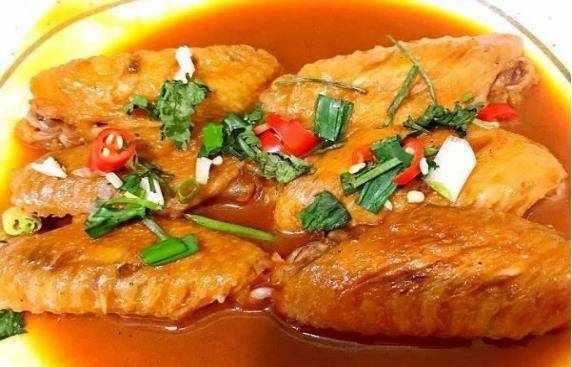 2、加入老抽、山西老陳醋、冰糖、鹽、料酒、蔥薑、八角、桂皮、月桂葉,適量熱水,以文火煮至湯收幹,不要淹沒雞翅。!