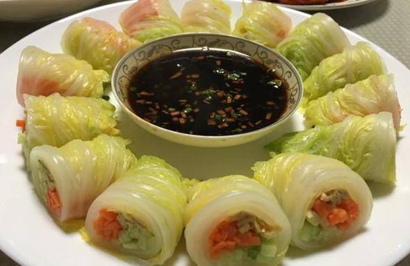 4、卷心菜葉卷好後對半切開;將鹽、糖、麻油和生抽混合在蘸醬中。