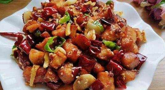 4、鍋內留少許底油,放入香薑、大蒜、幹辣椒、花椒,放入雞塊,加少許鹽和一勺白糖提鮮,放一勺白芝麻,煎至順滑,就可以上桌瞭!