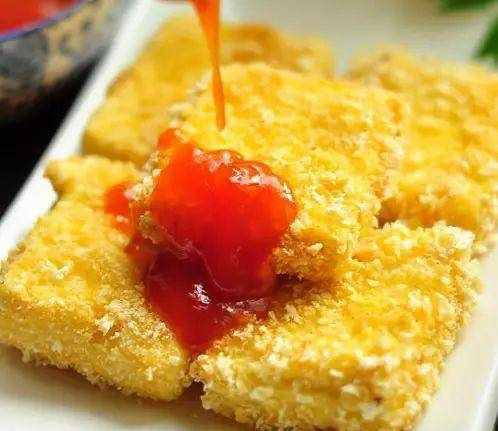 材料:豆腐半塊,油適量,鹽適量,番茄醬2湯匙,白糖1勺,九度米醋1勺,水淀粉少許,面包屑適量、面粉適量、雞蛋1個