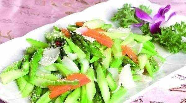 材料:綠蘆筍(200克)、鮮百合(5朵)、鹽(少許)、食用油(少許)。