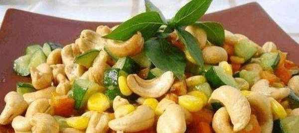 3.鍋內燒熱少許油,將薑末爆香,先倒入胡蘿卜丁翻炒至7-8熟,再加入玉米粒、腰果和黃瓜丁翻炒。炒熟,最後加鹽和雞精調味即可上桌。