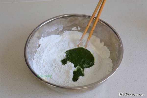 步驟3:取糯米粉250克、粘米粉250克,攪拌均勻,再取400克艾葉漿糊,攪拌。