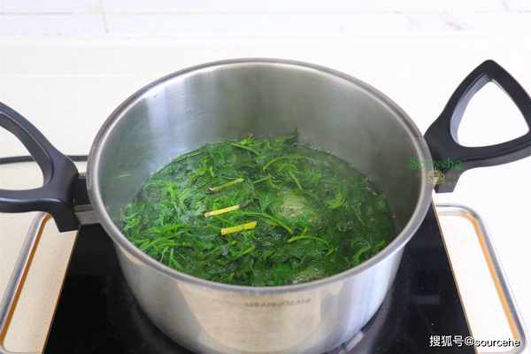 步驟1:艾葉精心挑選嫩葉,清水浸泡,清洗,洗幹凈之後撈出瀝幹水。鍋裡倒入適量的水煮沸之後,放入艾葉,加少許生薑絲,一點點小蘇打。