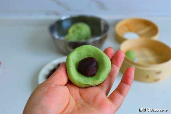 技巧4:餡料與青團皮的比例,豆沙餡20克,青團皮40克,青團做成60克一個,如果餡料太多,比較甜,影響青團的香氣。技巧5:和面團的時候要用力搓,把面團揉搓成柔軟的面團,然後靜放15分鐘。這樣制作的青團,細膩、軟糯,濃濃的艾葉香氣。