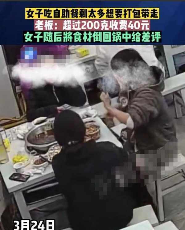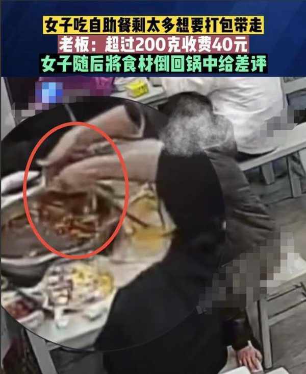 四川,成都。女子和朋友去吃自助,因拿的菜太多沒有吃完,便決定打包帶走,店傢告知超過200克就要收取40元錢。女子一聽說要收錢,就將裝好的菜倒回鍋中,還給瞭該店一個差評:服務態度賊差。