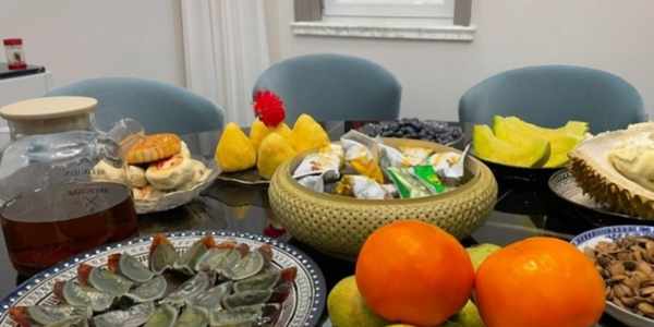 我們一起來看看飯後甜點都有些什麼,有梨子、柿子、皮蛋、瓜子、窩窩頭、蒸南瓜、榴蓮、酥餅、月餅。不是飯後甜點嗎,吃飽瞭還吃酥餅、窩窩頭和月餅,看著有點撐啊。