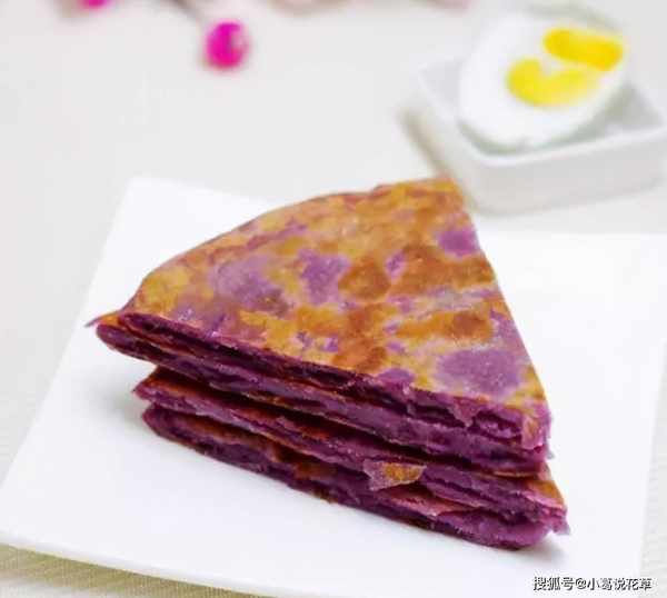 1、蒸好的紫薯去皮,用搗碎的鏟子壓成紫薯泥