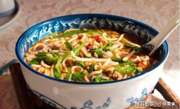 3、小鍋置火上,燒開湯,加入白胡椒粉、薑末,煮的時候把肉剁碎攪勻,放鹽、咸醬油、切碎的蔬菜加水,然後加入米粉來,等它煮沸。加入韭菜角、豌豆尖、豆芽,待湯再次沸騰,出鍋前,在鍋中加入辣椒油,倒入普通的面湯碗中,用蔥花和香菜裝飾。