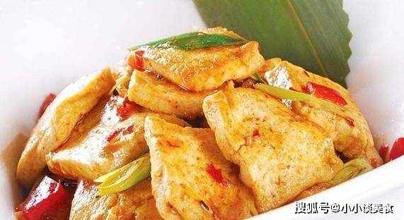 做法:1、杏鮑菇和豆腐切長條厚片,入油鍋炸至焦爛;紅辣椒焯水去皮去籽切片待用。
