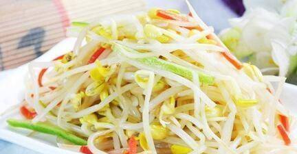 配料:豆芽200克,木耳1條,胡蘿卜20克,黃瓜30克,燈籠椒1個,生薑20克,鹽1/4茶匙,糖1/2茶匙,白醋1/4茶匙