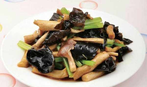 原料:茶樹菇200克、香菇50克、芹菜35克、細鹽、鮮味醬油、雞湯、蔥、薑、香油。