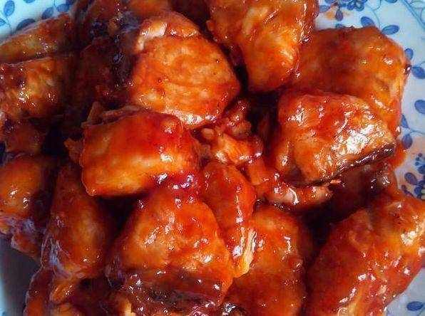 2、熱鍋,倒入油,將魚煎至微金黃。再煎魚片。留少許油,倒入番茄醬,加糖,加水炒成醬汁。加入魚塊並攪拌一下。從平底鍋上菜。