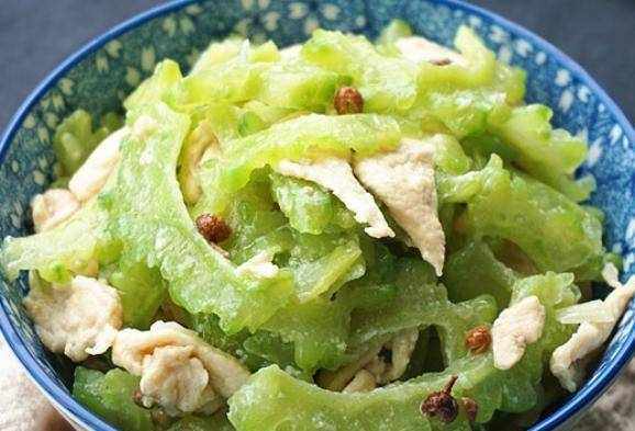 3、鍋中油燒熱,放入花椒、洋蔥炒香,加入苦瓜片稍炒至透明呈藍色;