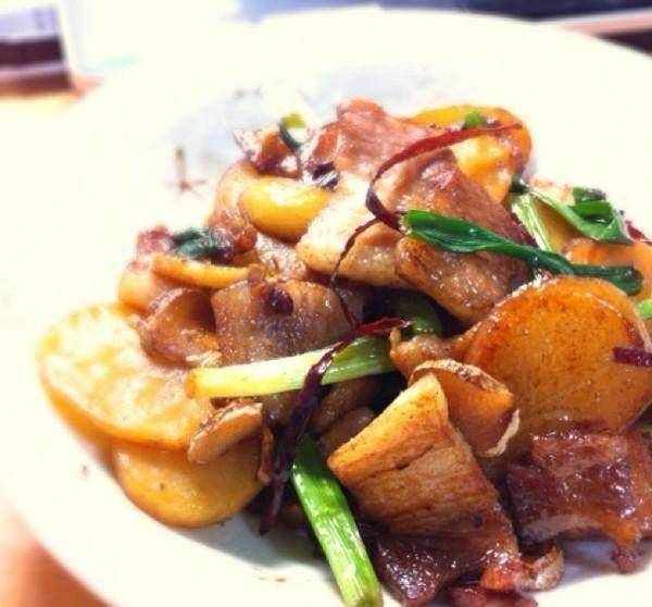 材料:五花肉、小土豆兩個、紅辣椒、蔥花、油、鹽、醬油;