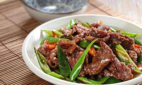 4、繼續加少許油,倒入青椒翻炒幾下至軟,倒入牛肉翻炒1分鐘左右,加鹽調味,最後加入生粉。