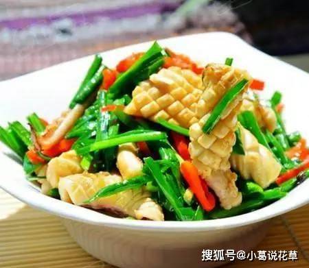 11)加入韭菜炒勻,撒上香油即可食用。
