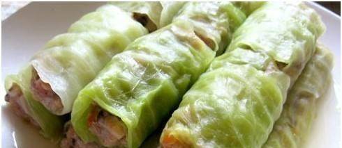 4、取一片白菜葉平放在案板上,中間放上炸好的各種餡料,把白菜葉從中間卷起來,把兩邊的葉子向中間對折卷成卷,然後把剩下的餡料和白菜葉放在替換包好的白菜葉上;