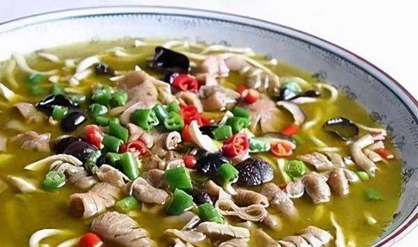 做法1.把肥腸切佛手花刀,黃喉改刀成片,然後投沸水鍋裡汆一水。把香菇改刀成小塊,與土豆粉條一起下到沸水鍋裡汆水。另把鮮青尖椒放入攪拌機,加適量清水打成青椒汁。