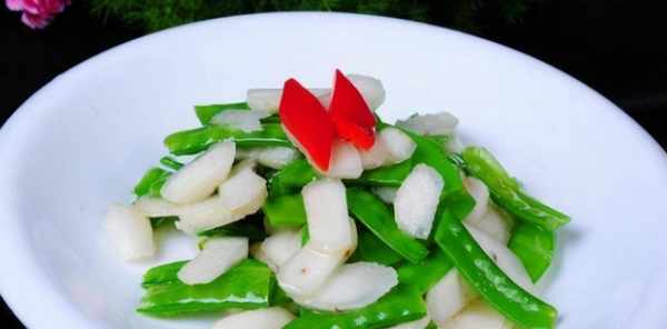 1、荷蘭豆去老筋,用清水洗凈,瀝幹水分備用,馬蹄洗凈,去皮切片。
