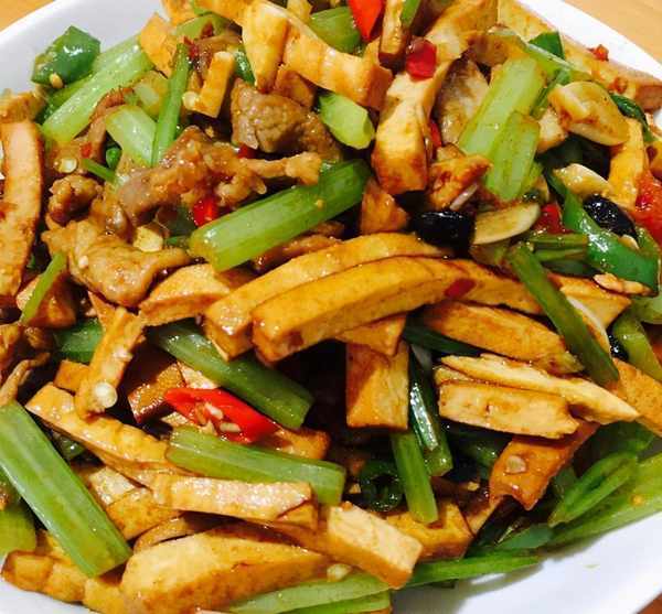 原料:豆腐幹260克(咸豆腐片)、芹菜220克、裡脊肉100克、豆豉1撮、蒜頭3瓣、青椒2個、小米椒3個、植物油、鹽、胡椒粉、生生抽、老抽、白胡椒粉、雞精適量;