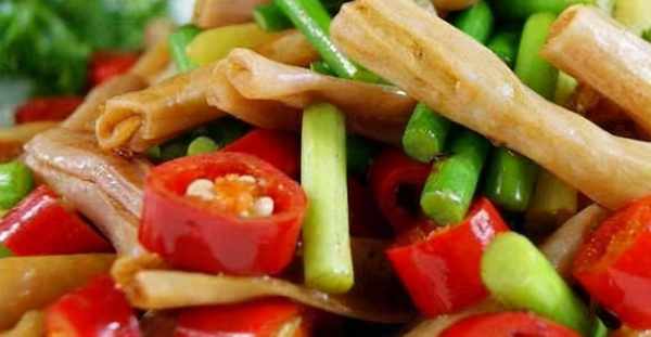 做法:1、豆腐皮洗凈後,沿一側卷起,切成細條。