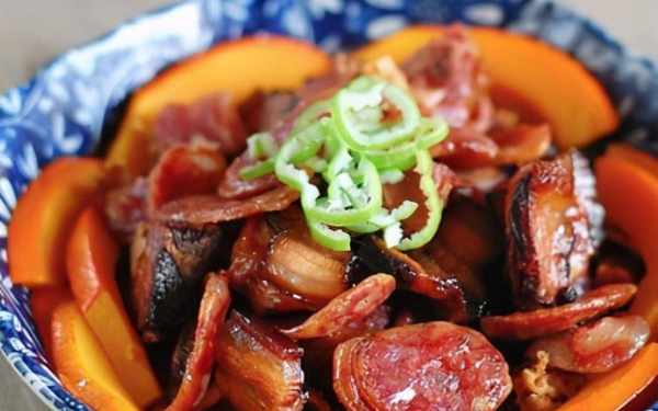 原料:香腸、培根、培根、南瓜、薑片、料酒、鹽、糖