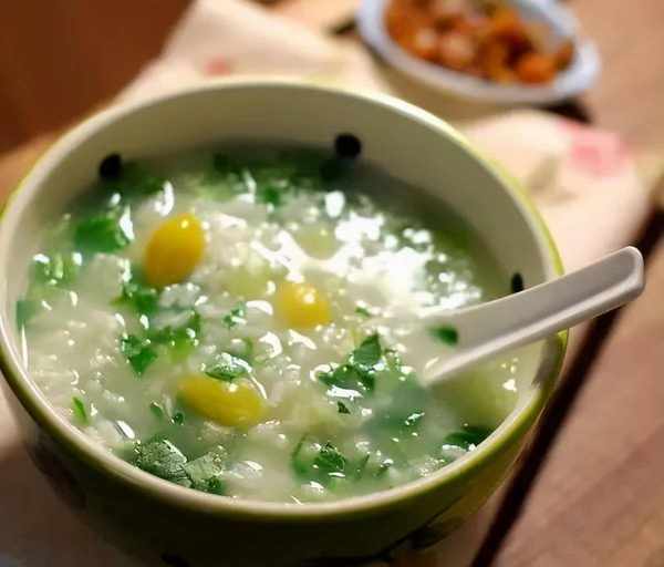 做法:將大米洗凈,放入鍋中煮粥;將雞蛋打入碗中,慢慢倒入粥中,邊煮邊攪拌;加入切碎的綠色蔬菜,煮3-5分鐘,從鍋中取出。加少許鹽調味。