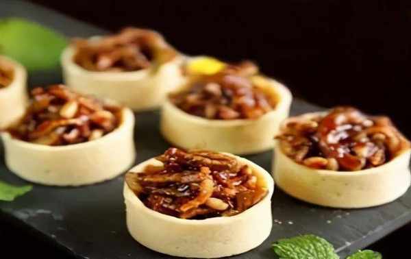 4.鍋內留底油,加入蒜薑爆香,加入材料,加入老抽、糖、雞精翻炒均勻,倒入已煮熟的鰻魚絲、松子和少許辣醬翻炒,勾芡炒勻,將份量放入事先準備好的酥皮撻中裝盤。