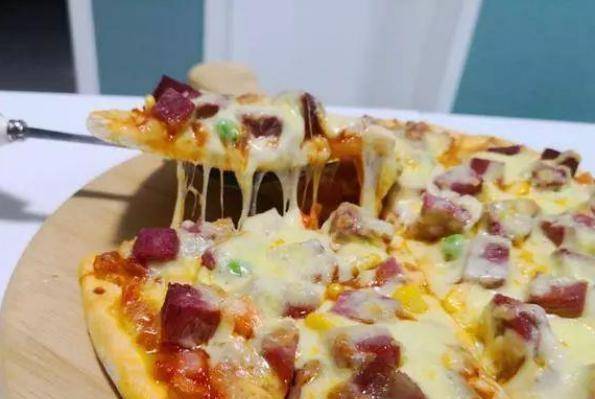 1.將幾克牛奶加熱至40度,讓酵母粉溶解,倒入面粉揉成面團,靜置約4小時。醒發後,揉成光滑的面團,放氣,搟成薄片,放入披薩盤中,壓出一邊,用叉子在中間戳緊小孔,烤箱預熱180度10分鐘。放蛋糕前先把胚放進去,烤10-15分鐘,表皮凝固後取出。