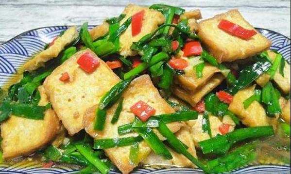 配料:韭菜200克,豆腐300克,辣椒醬10克,淀粉10克,鹽3克,紅辣椒5克
