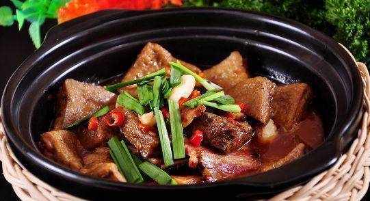 1.將牛胸肉切成小塊,放入沸水中焯一下,撈出。