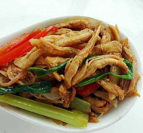6.加入洋蔥和磨碎的紅辣椒炒至軟;上菜前加入芹菜和細香蔥;最後淋上少許香油即可上桌;