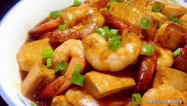 平底鍋燒熱,倒入少許植物油,蝦仁變色撈出,鍋內留底油爆香蔥薑蒜,將調料倒入碗中,加水50毫升煮至燒開,倒入豆腐煮兩分鐘,倒入。加入蝦,再滾一分鐘,用淀粉粘合。