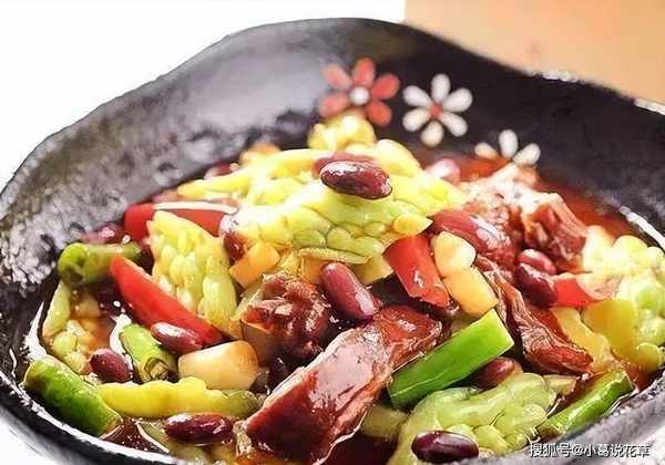 2、幹凈的鍋裡放油,先加入薑末、蒜末和甜面醬炒香。倒入鴨塊拌勻,加入適量鮮湯,加入鹽、十三香、醬油、味精、雞精一起煮成鴨塊。加入苦瓜丁、青紅椒丁、紅豆丁,一起煮至軟爛,煮10分鐘,即可食用。