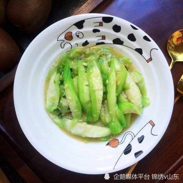食材:絲瓜、蔥、鹽、雞精、胡椒粉、水淀粉、色拉油、香油