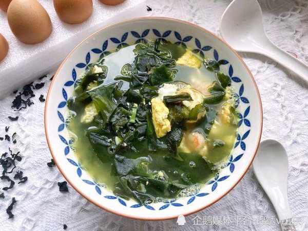 食材:裙帶菜,蝦仁,雞蛋,嫩豆腐,蔥花,薑絲,蒜末。