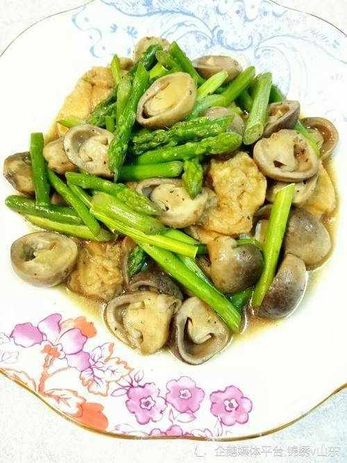 5、接著放入焯過水的草菇和蘆筍,依次加入蠔油,鹽,雞粉翻炒均勻即可。