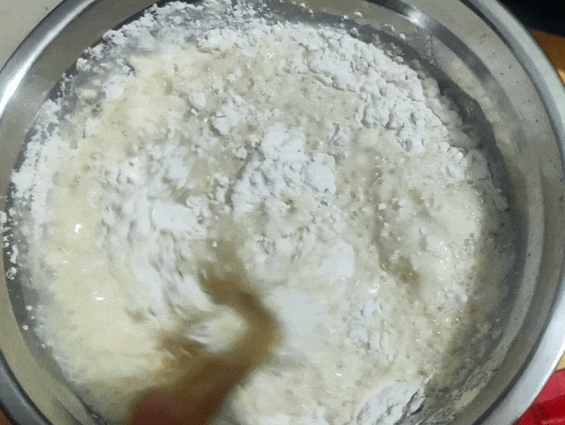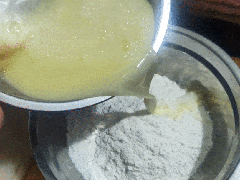 將剛才攪打好的液體倒入面粉中。