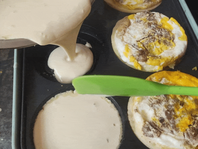 將剛才的雞蛋肉餅蓋在面糊上。