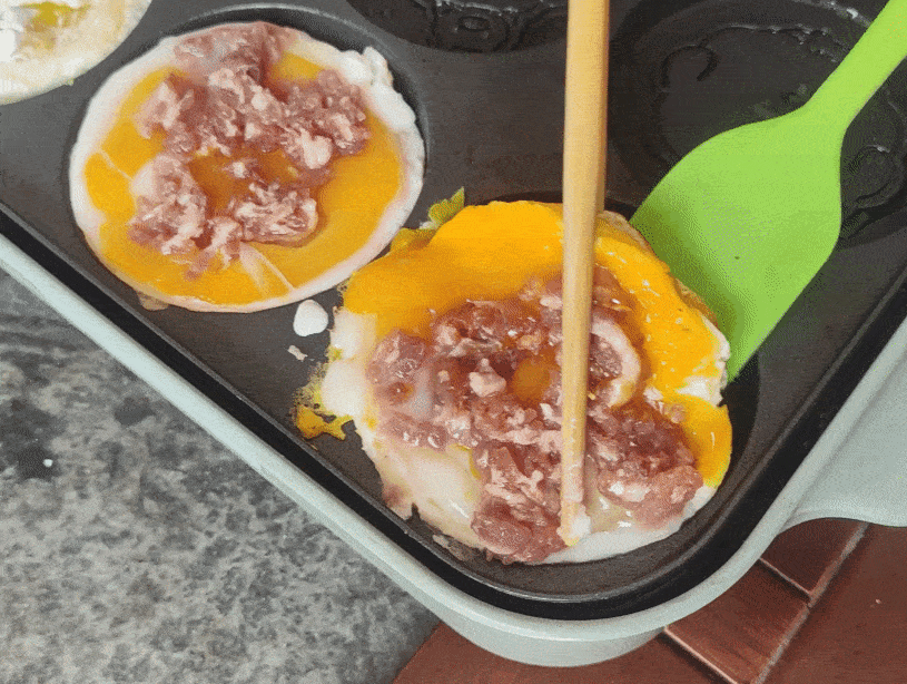 待雞蛋底面差不多熟透,翻面,煎有肉末的一面。