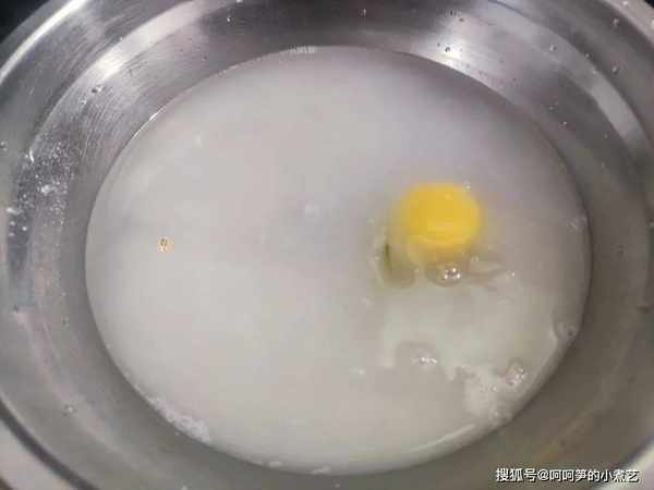溫水裡加入酵母、泡打粉、鹽、糖、雞蛋。