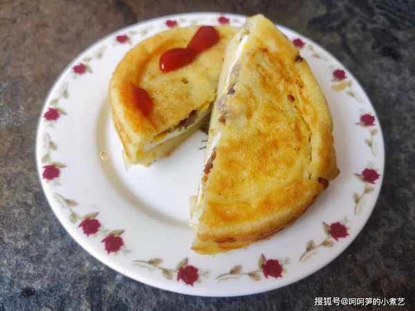 等面糊底部同樣稍稍凝固,將前一部分的雞蛋肉餅蓋在新的面糊上,即雞蛋肉餅位於中間位置。