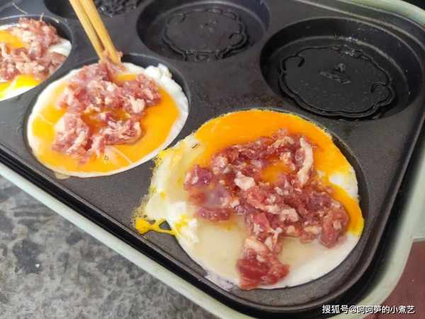 雞蛋底下一面稍微凝固的時候,加入肉末,也可以加點蝦仁或蔬菜,喜歡什麼加什麼。