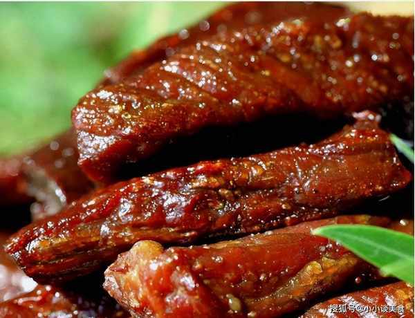 2、將煮熟的牛肉切成小塊,加入原料和原湯,在鍋中翻炒,加入白糖和少許水調成很稀的糖漿,將蔥花倒入牛肉幹中,攪拌均勻即可食用從鍋裡出來。