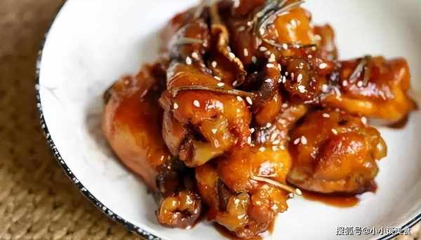 8、燉至湯汁濃稠,轉大火收汁。收汁時,雞翅根要多翻動。在烤盤上撒一些白芝麻。
