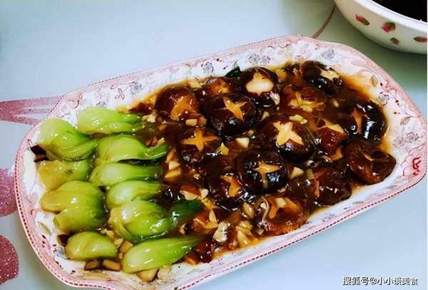 2、小青菜焯水去草酸。水裡加一勺鹽,讓青菜更綠;將香菇用熱水煮沸,盛入盤中;