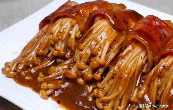 1.金針菇洗凈去頭,培根切兩段。將金針菇和培根卷起來,用牙簽固定。