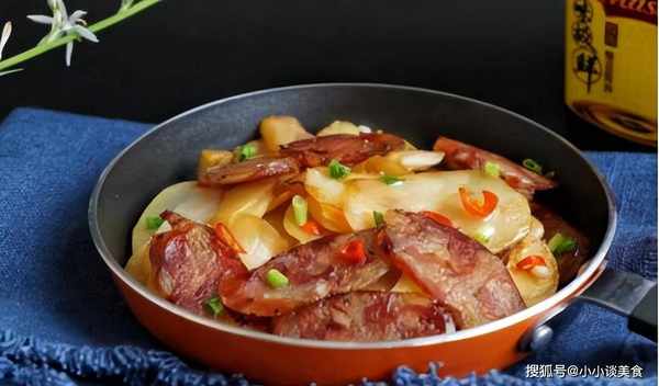 3.加入香腸片翻炒。當香腸變色時,加入土豆片翻炒。